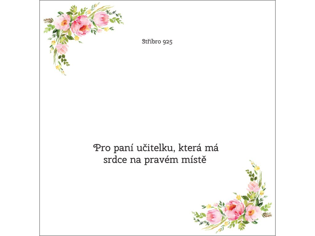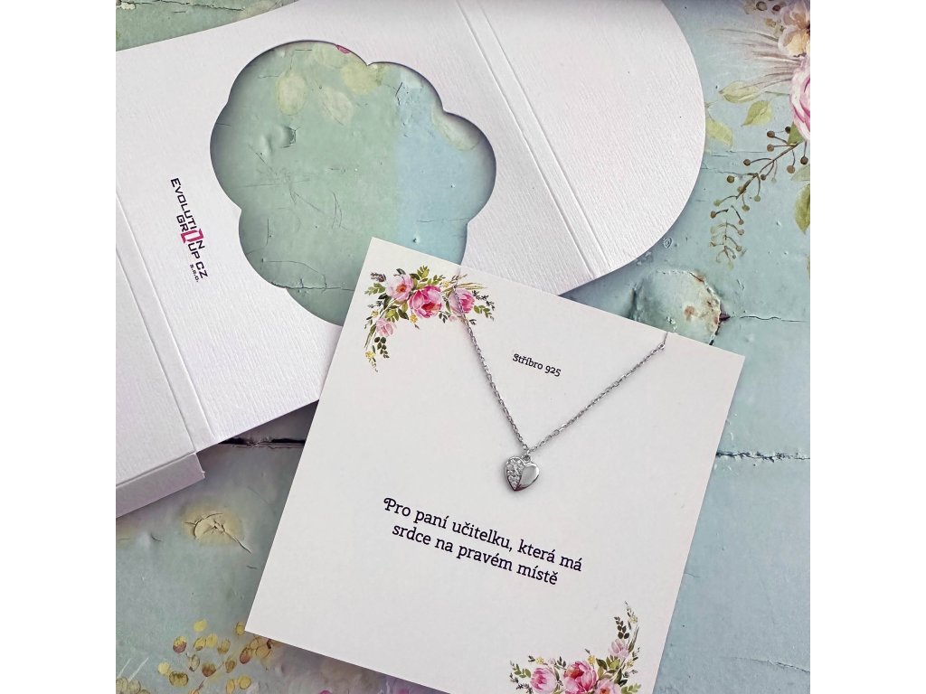 Darčekový set obsahuje strieborný náhrdelník srdiečko so zirkónikmi , ktorý je zavesený na darčekovej karte s nádherným prianím „Pre pani učiteľku, ktorá má srdce na pravom mieste“. Učiteľ je veľmi dôležitým človekom na ceste k dospelosti a nie je nič lepšie ako férová, milá a srdečná učiteľka. Srdce značí odvahu, statočnosť, ale hlavne vyjadruje vďaku žiakov za to, akú skvelú učiteľku majú.
