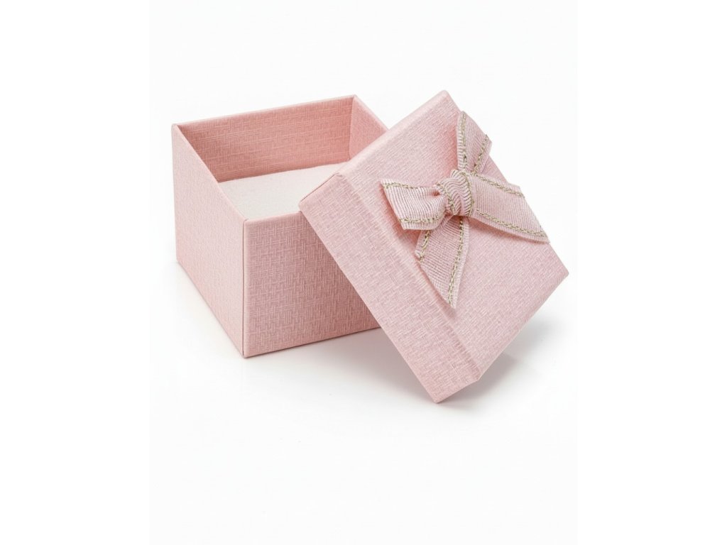 Elegantná ružová papierová krabička s mašľou, vhodná na prsteň alebo náušnice. Ideálna na darčekové balenie šperkov, bez potlače, v rozmere 50 × 50 × 35 mm.