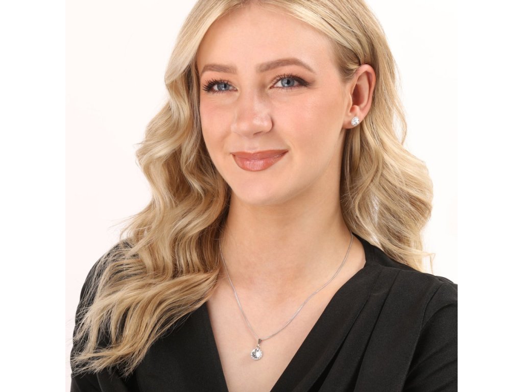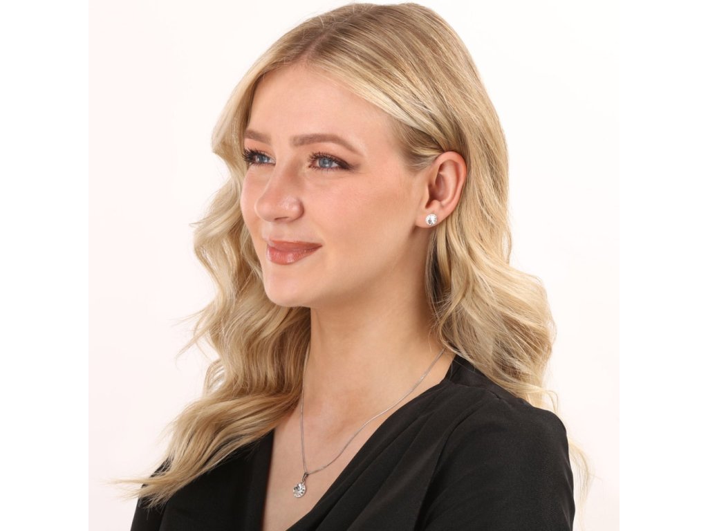 Sada 39352.1 fuchsia obsahuje náušnice perličky a retiazku s príveskom. Šperky sú vyrobené zo striebra rýdzosti 925/1000, ktoré prešlo povrchovou úpravou ródiom. Ródium chráni šperk proti sčernaniu, zožltnutiu aj poškrabaniu. Prívesok aj náušnice sú zdobené okrúhlym bielym Swarovski krištáľom, ktorý je navyše olemovaný ešte malými trblietavými Swarovski krištálikmi v bielej farbe. Náušnice majú zapínanie na spoľahlivú skrutku. Keďže šperky neobsahujú žiadny prídavok niklu, môžu ich bez obáv nosiť aj alergici.