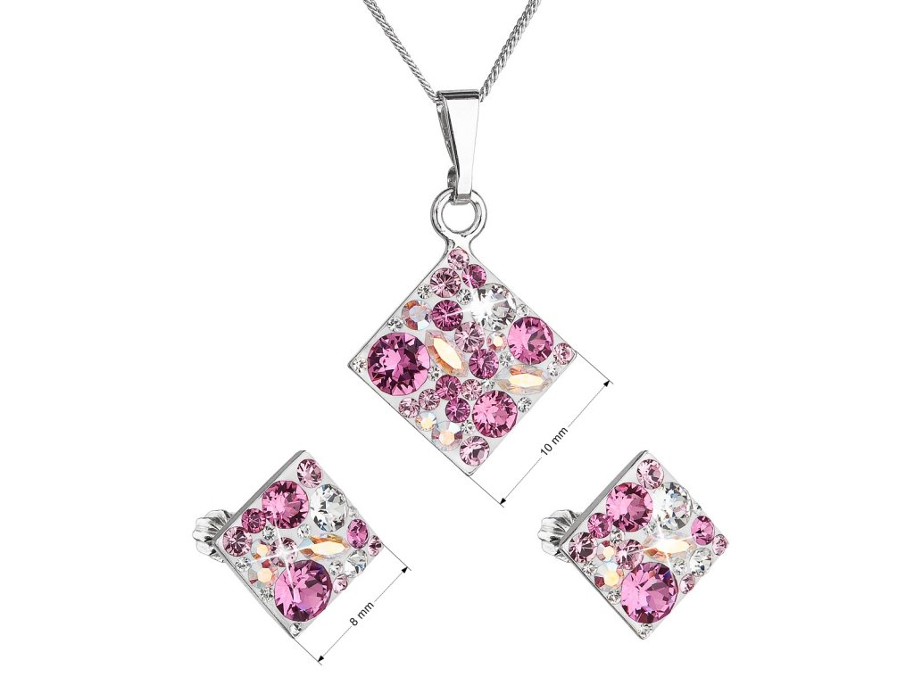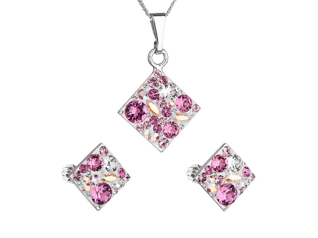 Súprava šperkov 39126.3 obsahuje náušnice typu kôstky a retiazku s príveskom. Šperky sú v tvare kosoštvorca a sú vyrobené zo striebra rýdzosti 925/1000, ktoré prešlo povrchovou úpravou ródiom. Ródium šperk chráni pred sčernením, zažltnutím a poškrabaním. Prívesok aj náušnice sú bohato zdobené trblietavými Swarovského krištáľmi v rôznych farbách. Náušnice majú zapínanie na skrutku. Keďže šperky neobsahujú žiadny prídavok niklu, môžu ich bez obáv nosiť aj alergici.