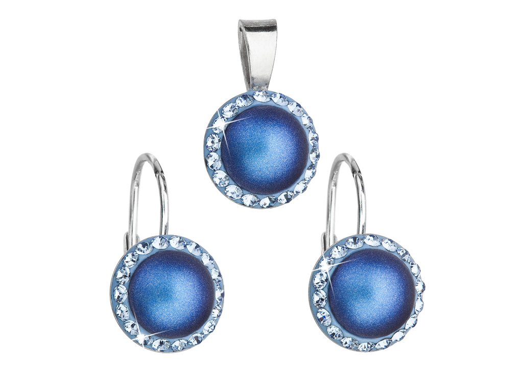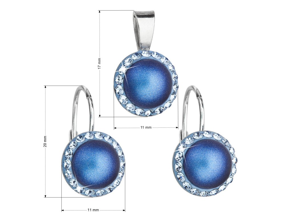 Súprava 39091.3 obsahuje visiace náušnice a prívesok s modrou Swarovského perlou a krištáľmi. Šperky sú vyrobené zo striebra rýdzosti 925/1000, ktoré prešlo povrchovou úpravou ródiom. Ródium šperk chráni pred sčernením, zažltnutím a poškrabaním. Prívesok aj náušnice sú zdobené Swarovského perlou, ktorá je naviac olemovaná malými trblietavými Swarovského krištáľmi. Náušnice majú zapínanie na klapku.