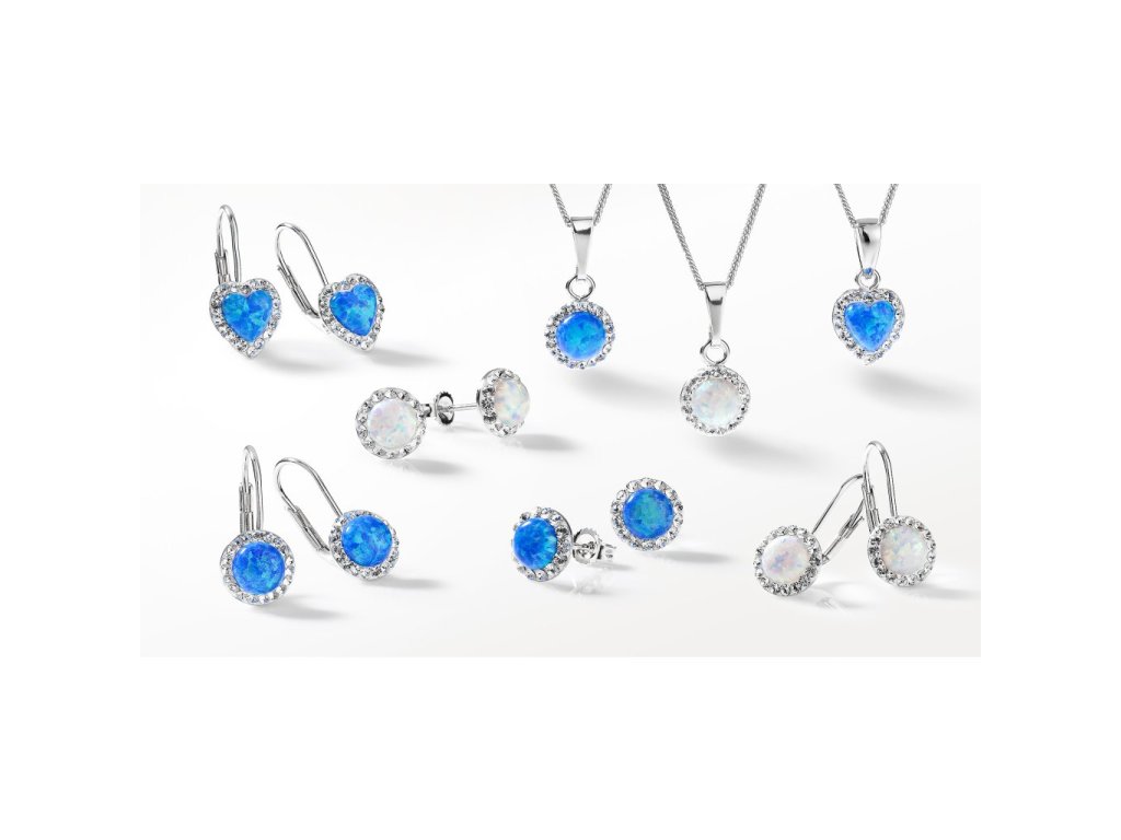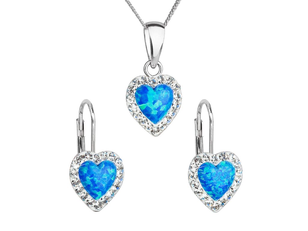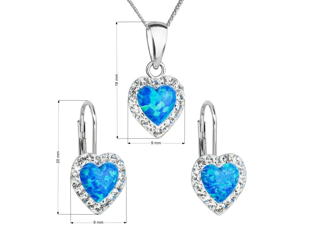 Sada 39161.1 obsahuje visiace náušnice a retiazku s príveskom v tvare srdiečka. Šperky sú vyrobené zo striebra rýdzosti 925/1000, ktoré prešlo povrchovou úpravou ródiom. Ródium chráni šperk proti sčerneniu, zožltnutiu i poškriabaniu. Prívesok aj náušnice sú zdobené modrým syntetickým opálom, ktorý je navyše olemovaný ešte malými trblietavými Preciosa krištáľmi v bielej farbe. Náušnice majú zapínanie na klapku. Keďže šperky neobsahujú žiadny prídavok niklu , môžu ich bez obáv nosiť aj alergici.