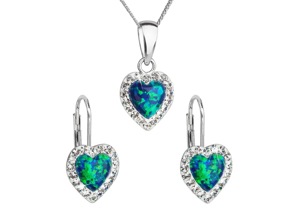 Sada 39161.1 obsahuje visiace náušnice a retiazku s príveskom v tvare srdiečka. Šperky sú vyrobené zo striebra rýdzosti 925/1000, ktoré prešlo povrchovou úpravou ródiom. Ródium chráni šperk proti sčerneniu, zožltnutiu i poškriabaniu. Prívesok aj náušnice sú zdobené zeleným syntetickým opálom, ktorý je navyše olemovaný ešte malými trblietavými Preciosa krištáľmi v bielej farbe. Náušnice majú zapínanie na klapku. Keďže šperky neobsahujú žiadny prídavok niklu , môžu ich bez obáv nosiť aj alergici.
