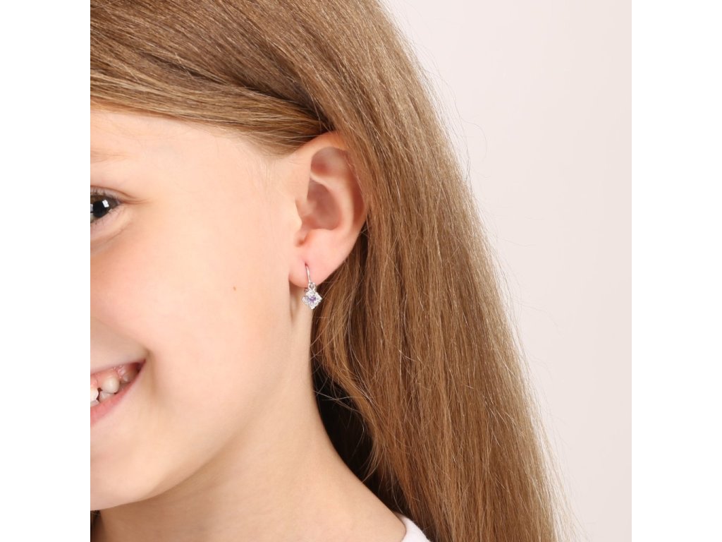 Strieborné detské náušnice visiace so zirkónom fialová kvetinka 11175.3