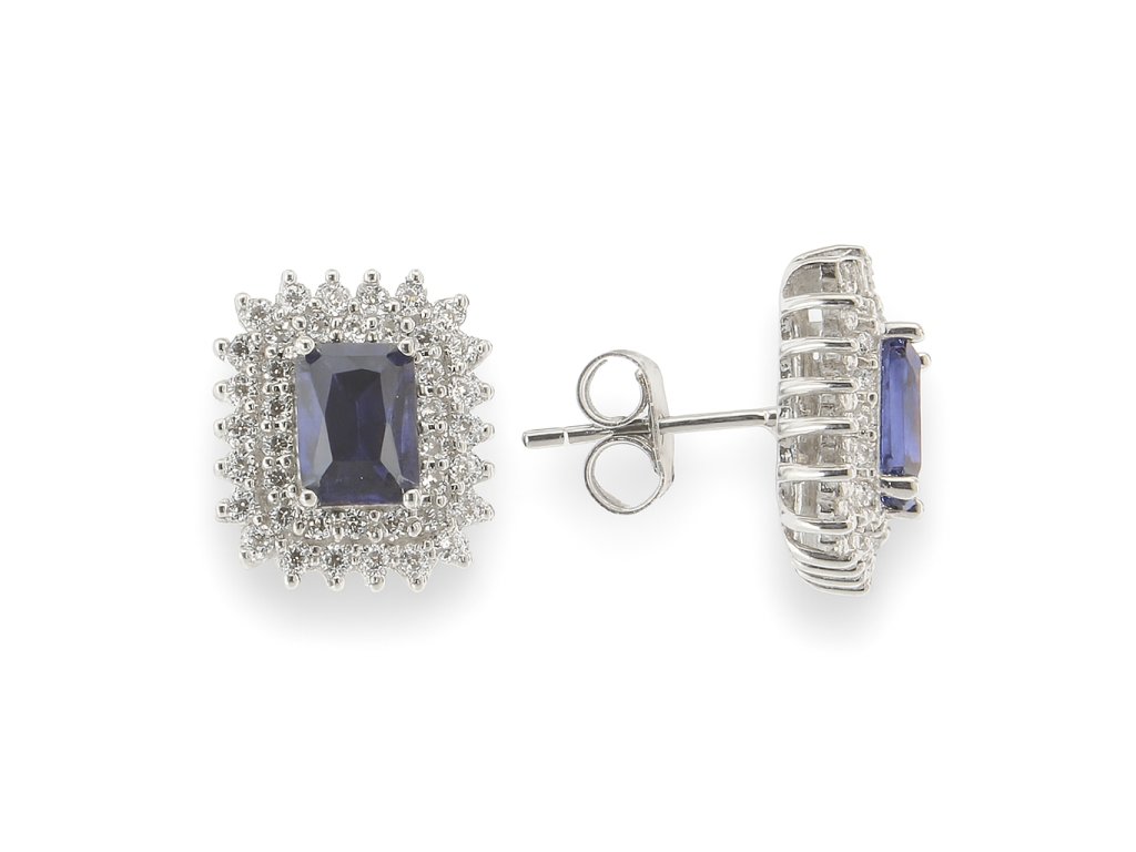 Strieborné hranaté náušnice s modrým a čírymi zirkónmi