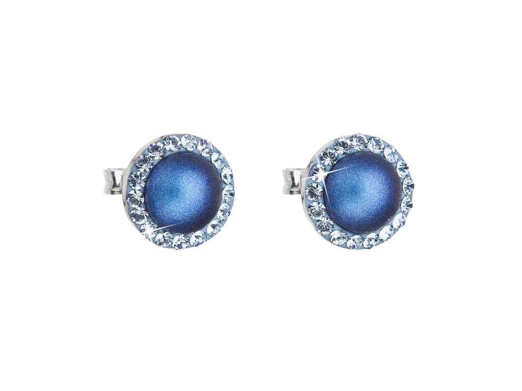 Strieborné náušnice kôstka s krištáľmi Swarovski a tmavomodrú matnou perlou okrúhle 31214.3