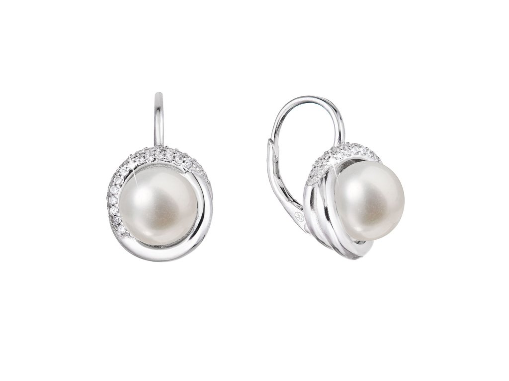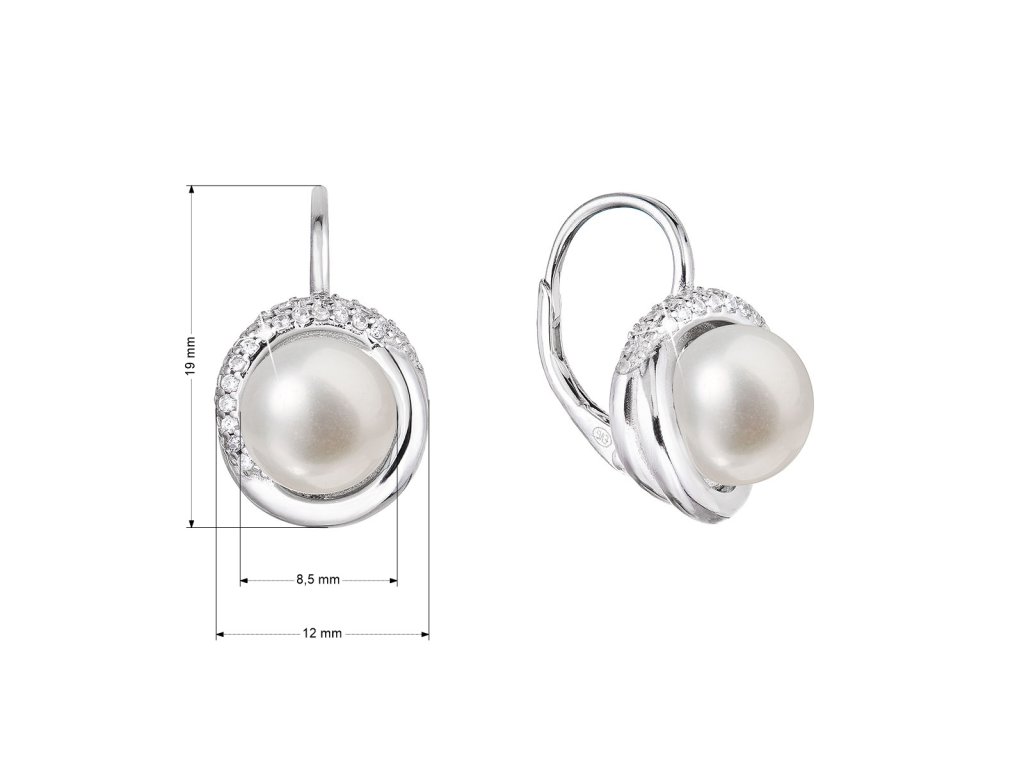Strieborné náušnice visiace s bielou riečnou perlou a zirkónmi okrúhle 21075.1