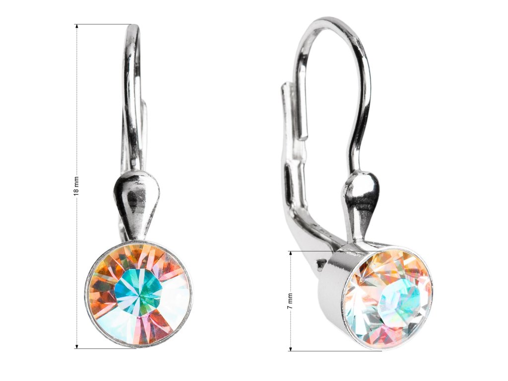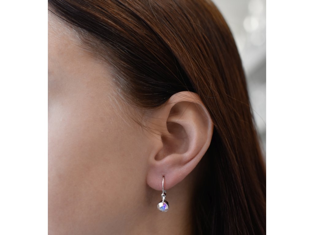 Náušnice sú vyrobené zo striebra o rýdzosti 925/1000 s povrchovou úpravou ródiom a sú zdobené okrúhlym Swarovského krištáľom s AB efektom. Náušnice zapnete na klapku, ktorá ich spoľahlivo ochráni pred nechcenou stratou. Do náušníc nie je pridaný nikel, a tak ich bez obáv môžu nosiť aj alergici.