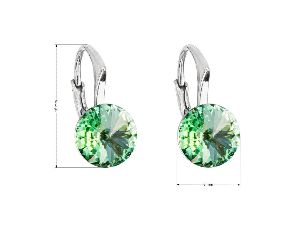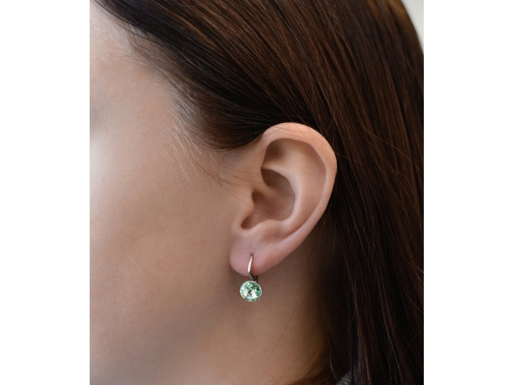 Náušnice sú vyrobené zo striebra o rýdzosti 925/1000 s povrchovou úpravou ródiom a sú zdobené 8 mm širokým okrúhlym Swarovského krištáľom v zelené farbe. Náušnice zapnete na klapku, ktorá ich spoľahlivo ochráni proti nechcenej strate. Do náušníc nie je pridaný nikel, a tak ich bez obáv môžu nosiť aj alergici.