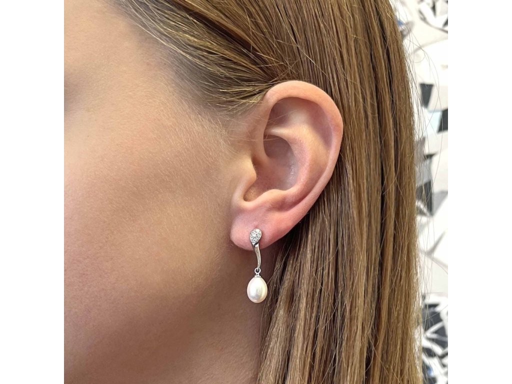 Strieborné náušnice s pohyblivou bielou riečnou perlou a trblietavými zirkónmi sú očarujúce.