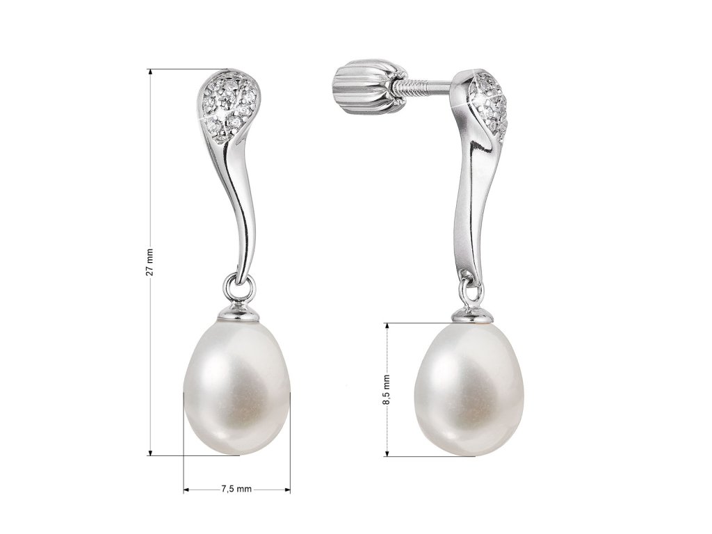 Náušnice 21097.1B sú vyrobené zo striebra o rýdzosti 925/1000 vrátane povrchovej úpravy ródiom. Ródium ochráni šperk proti sčerneniu, zožltnutiu i poškriabaniu. Biele riečne perly sú oválneho tavru o veľkosti 8,5 x 7,5 mm a kvality AA . Náušnice sú navyše zdobené aj niekoľkými priezračnými zirkónmi, ktoré ich krásne rozžiaria. Šperk neobsahuje prídavok niklu, a tak ho môžu nosiť aj ľudia náchylní na alergické reakcie. Náušnice majú zapínanie na balónik , ktorý ich ochráni proti nechcenej strate.