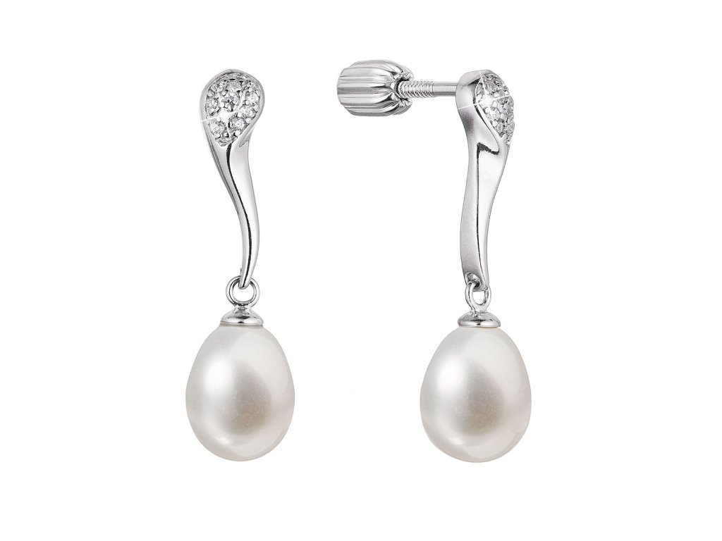 Strieborné náušnice visiace s oválnou riečnou perlou a zirkónmi biele 21097.1B