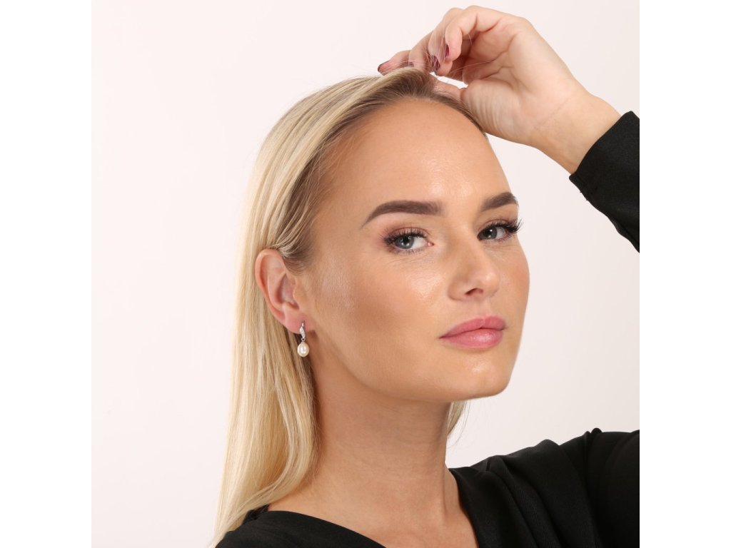 Strieborné náušnice s trblietavými zirkónmi a dominantnou oválnou riečnou perlou sú výrazné.