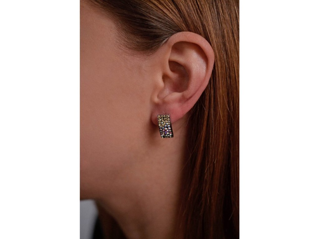 Visiace náušnice 31303.3 sú vyrobené zo striebra o rýdzosti 925/1000 so špeciálnou povrchovou úpravou. Ródium ochráni náušnice pred sčernením, zožltnutím aj poškriabaním. Neobsahujú žiadny nikel , a tak sa nemusíte obávať alergických reakcií. Obdĺžnikový tvar je vysadený drobučkými krištáľmi Swarovski v rôznych farebných odtieňoch.