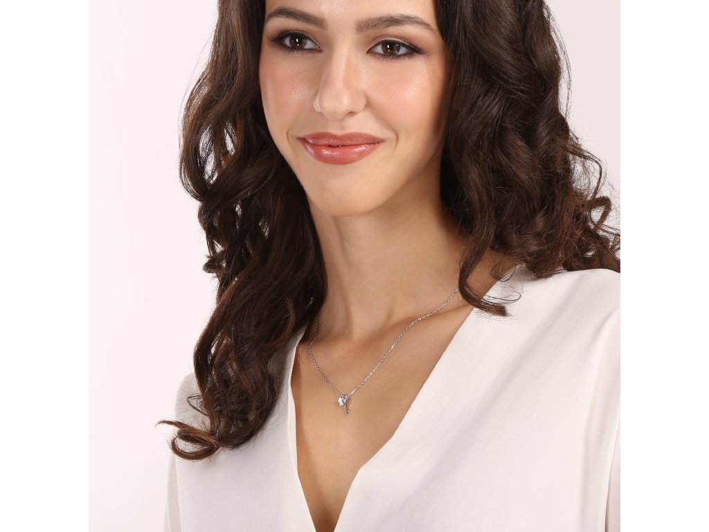 Strieborný náhrdelník s príveskom kľúča a srdca je romantickým symbolom lásky, dôvery a hlbokého prepojenia. Jemný prívesok v tvare kľúča evokuje myšlienku „kľúč k tvojmu srdcu“ , zatiaľ čo lesklé srdiečko osadené trblietavými zirkónmi dodáva šperku iskru a eleganciu.