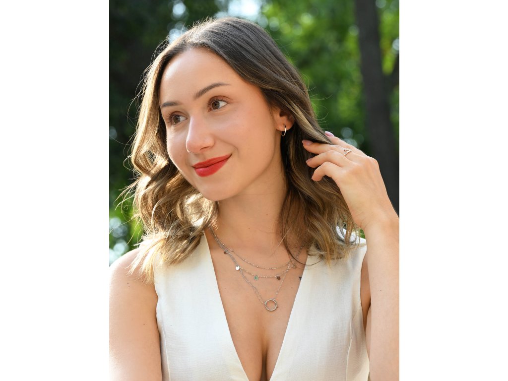 Hlavným prvkom náhrdelníka je lesklý krúžok, ktorý symbolizuje nekonečnosť a jednotu. Krúžok je vyrobený z kvalitného striebra, ktorému dodáva jemný a žiarivý lesk. Jeho jednoduchý dizajn ho robí všestranným doplnkom, ktorý sa ľahko kombinuje s rôznymi štýlmi oblečenia.