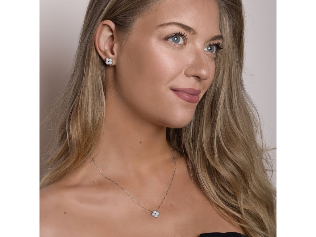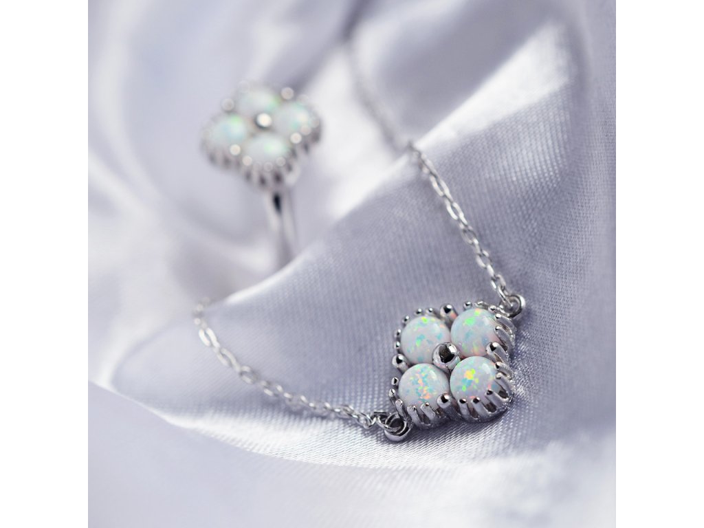 Šperk je vyrobený zo striebra rýdzosti 925/1000 a jeho povrch je navyše opatrený ródiom, ktorý šperk chráni proti oxidácii a dodáva mu väčšiu odolnosť aj lesk. Náhrdelník je zdobený príveskom v tvare štvorlístka, ktorý je zložený zo štyroch okrúhlych bielych syntetických opálov zasadených do zdobeného strieborného lôžka. Biele opálky prepožičiavajú šperku jemné dúhové odlesky , ktoré menia svoj nádych podľa uhla pohľadu. Vďaka tomu je každý váš pohyb sprevádzaný hrou farieb a svetla.