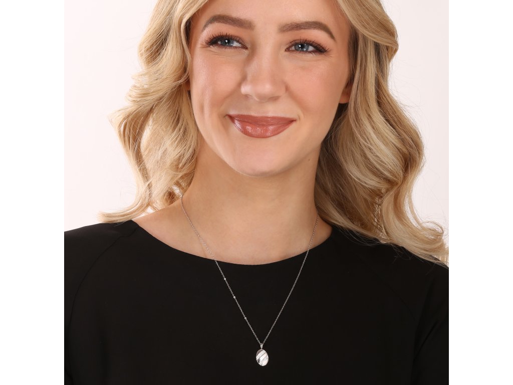 Tento náhrdelník je starostlivo navrhnutý tak, aby priťahoval pozornosť a pridával vášmu vzhľadu pôvab . Hlavným prvkom je oválny prívesok, ktorého hladký a lesklý povrch zdôrazňuje jeho elegantný tvar. Ovál symbolizuje nekonečnosť a kontinuitu, čo pridáva šperku hlbší význam. Dvojitý rad zirkónov pridáva šperku extra lesk a vytvára vizuálnu hĺbku.