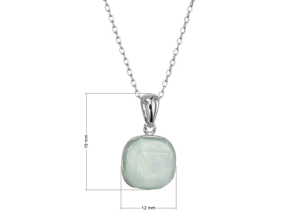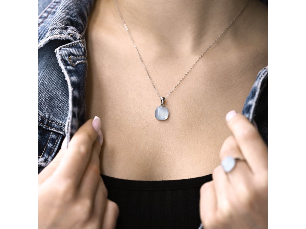 Náhrdelník je vytvorený zo striebra rýdzosti 925/1000 s povrchovou úpravou ródiom, ktorá dodáva šperku čistý a žiarivý lesk. Štvorcový prívesok je zdobený prírodným akvamarínom s charakteristickou ľadovo modrou farbou. Jemné hrany kameňa sú brúsené s mimoriadnou starostlivosťou a vytvárajú krehkú hru svetla, ktorá pripomína ľadové kryštály.
