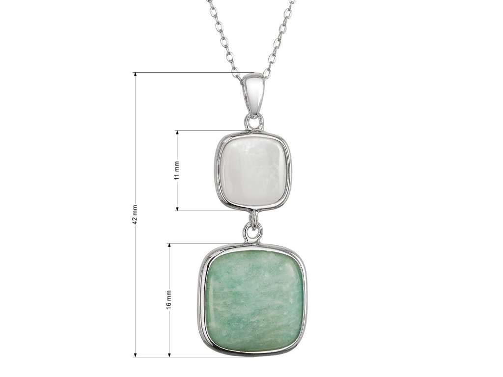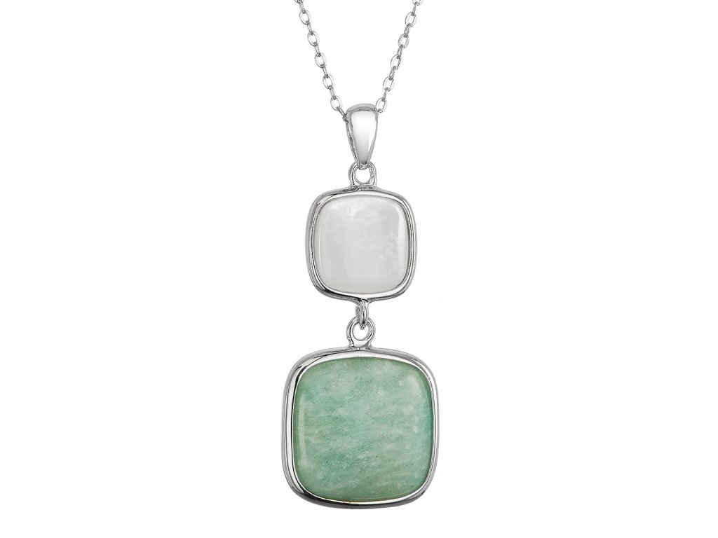 Náhrdelník s príveskom je umeleckým dielom, ktoré spája dokonalý lesk rhodiovaného striebra 925/1000 s výnimočnou krásou prírodných materiálov. Luxusný prívesok v tvare dvoch nad sebou zavesených štvorcov vytvára jedinečnú kompozíciu - väčší štvorec osadený sýtym zeleným prírodným amazonitom symbolizuje divokú energiu prírody, zatiaľ čo menší štvorec vyplnený jemnou bielou perleťou prináša krehkú eleganciu a pokoj.