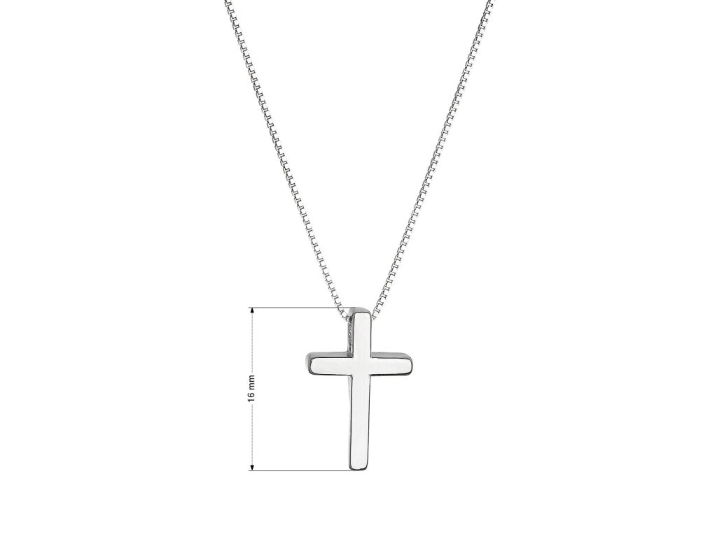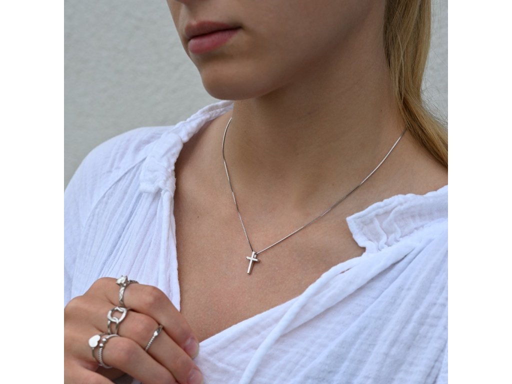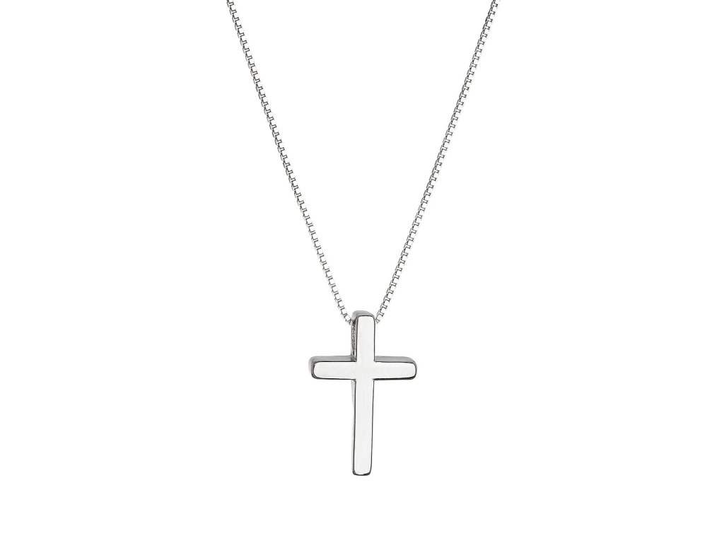 Tradičný náhrdelník v modernom jednoduchom prevedení s príveskom v tvare krížika z lesklého striebra. Retiazka je prevlečená priamo krížikom, takže samotný tvar kríža nenarúša už žiadne očko.