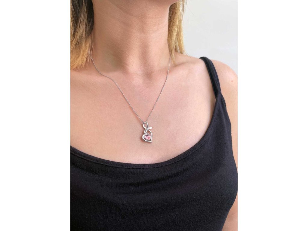 Na retiazke je zavesený strieborný prívesok v tvare srdca zdobený srdcovým ružovým Swarovski krištáľom.