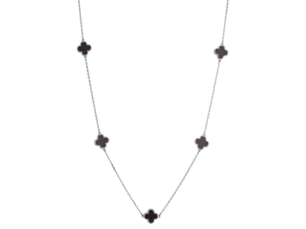 Jemný strieborný náhrdelník s pôvabnými štvorlístkami je symbolom šťastia a nadčasovej elegancie. Každý štvorlístok je vyplnený čiernym pinolitom , ktorý dodáva šperku jedinečný a tajomný charakter.