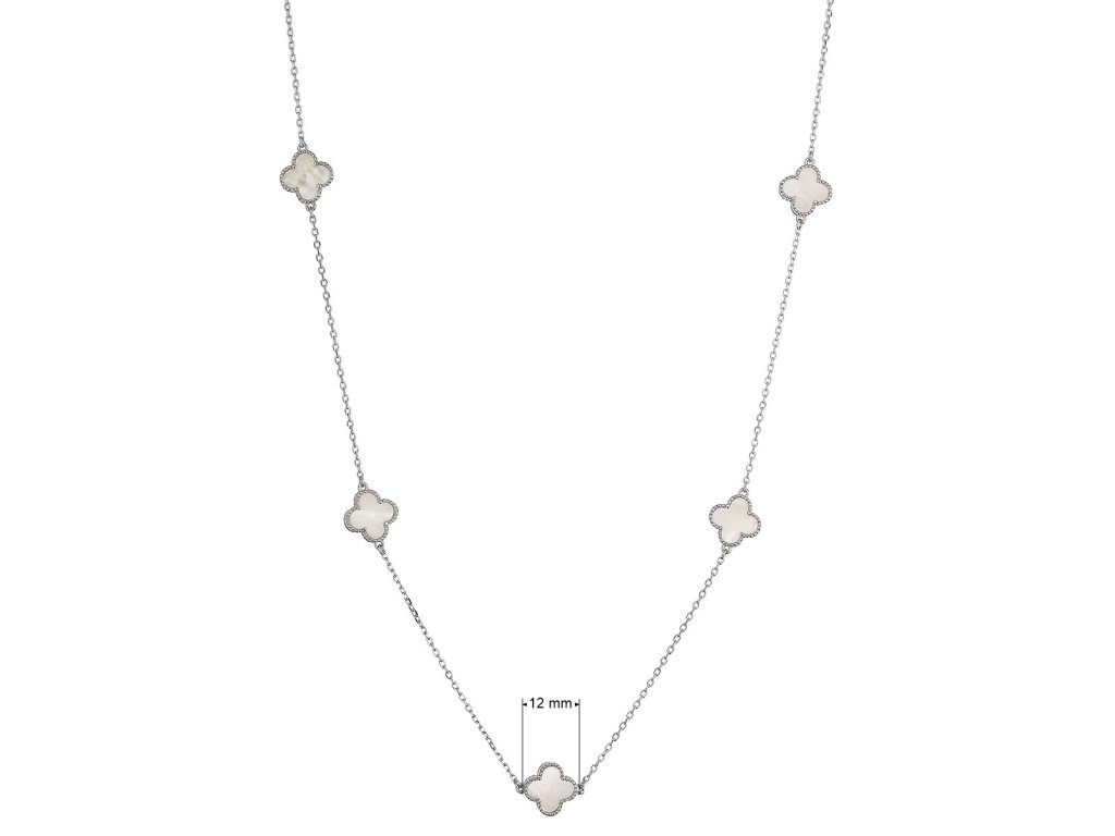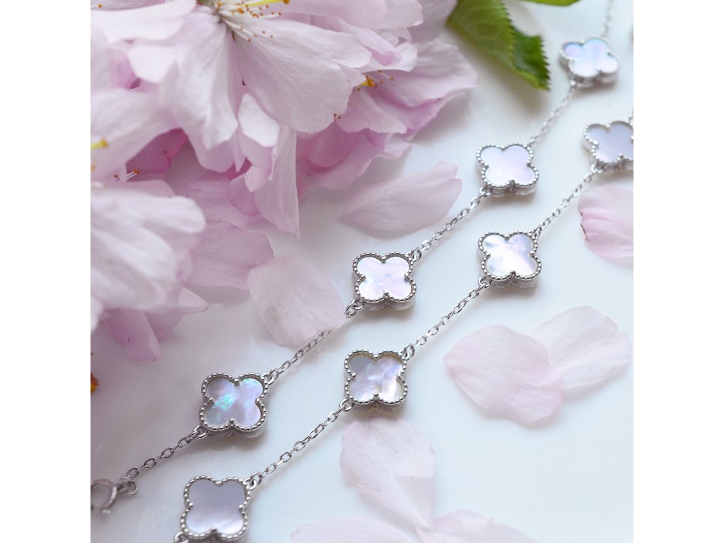 Jemný strieborný náhrdelník s pôvabnými štvorlístkami je symbolom šťastia a nadčasovej elegancie. Každý štvorlístok je vyplnený bielou perleťou, ktorá nádherne odráža svetlo a dodáva šperku kúzelný lesk.