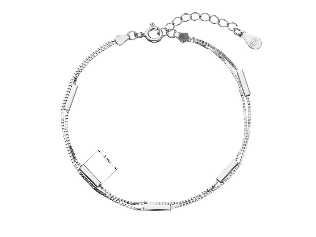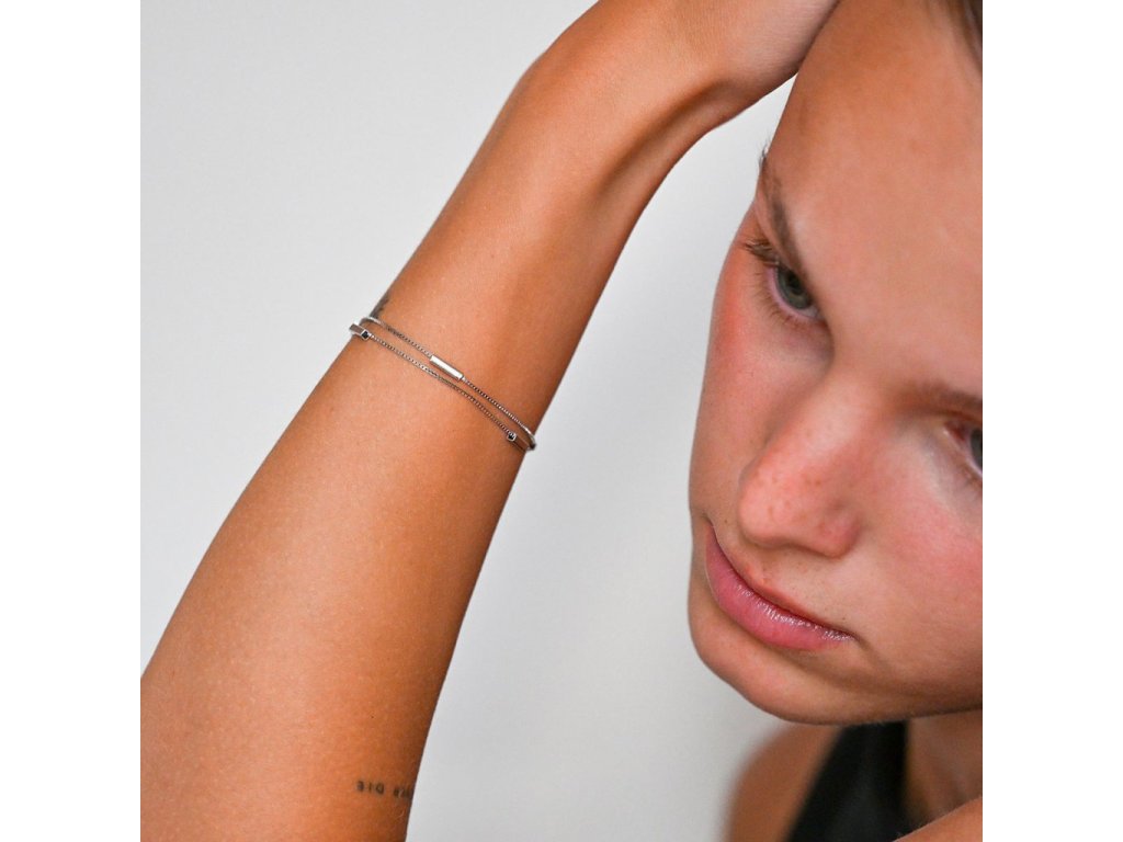Jemný, dvojitý náramok, ktorý sa dá obliecť každé ráno, hodí sa ku všetkému a je moderný. Náramok je vyrobený z dvoch rovnakých retiazok spojených v jeden náramok. Retiazka je v tvare kociek a po jej obvode sú navyše lesklé obdĺžniky, ktoré upútajú pohľad.