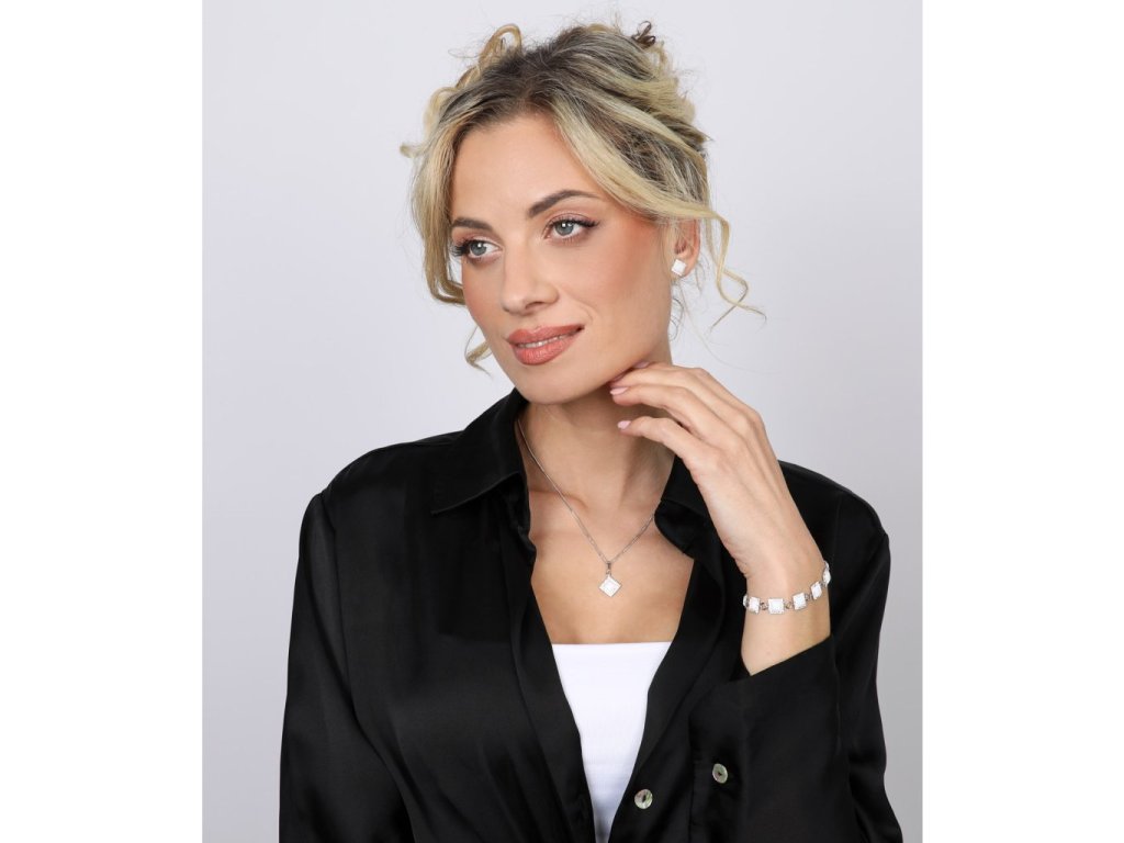Strieborný náramok 33047.1 je vyrobený zo striebra rýdzosti 925/1000, ktorého povrch bol ošetrený ródiom . Rhodium šperk ochráni proti sčernaniu, zožltnutiu aj poškriabaniu. Náramok je zložený zo strieborných štvorčekov, ktoré sú bohato vysadené Preciosa krištáľmi v bielej farbe a uprostred je štvorcový biely syntetický opál. Keďže náramok neobsahuje prídavok niklu , môžu ho bez obáv z alergickej reakcie nosiť aj alergici.