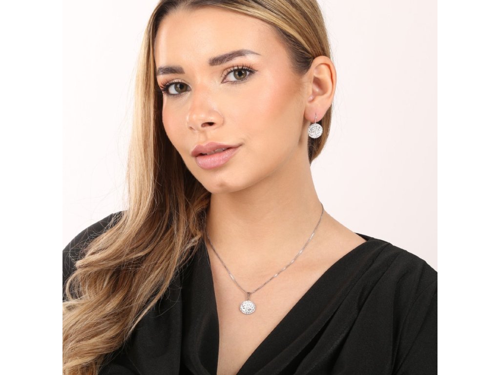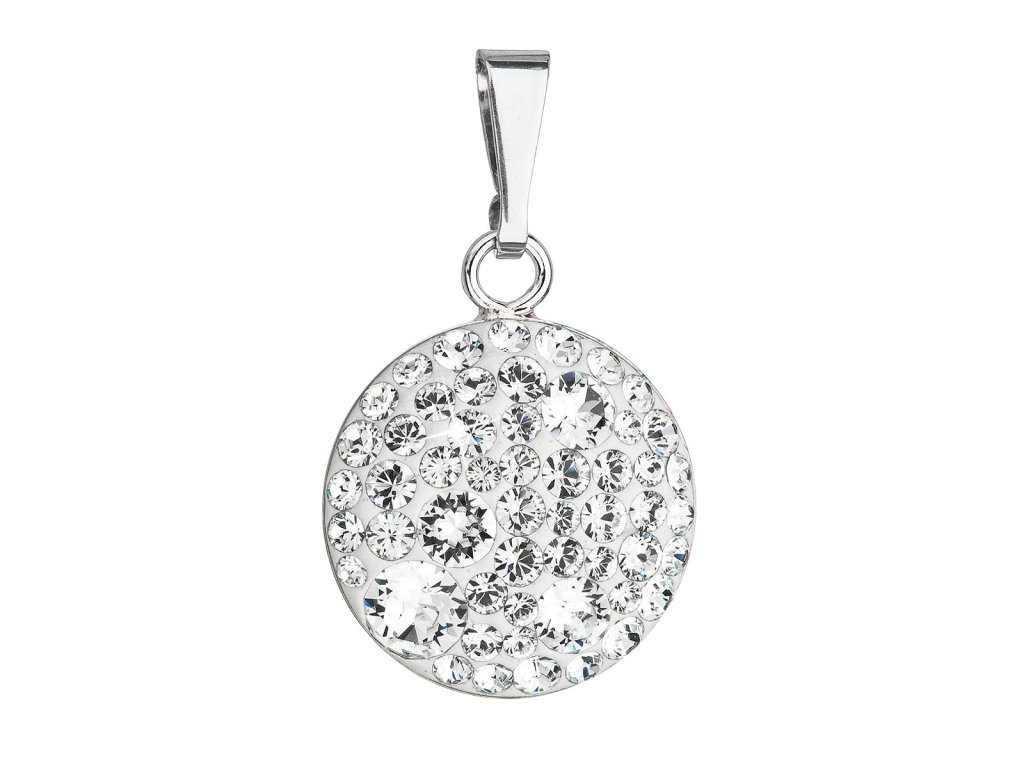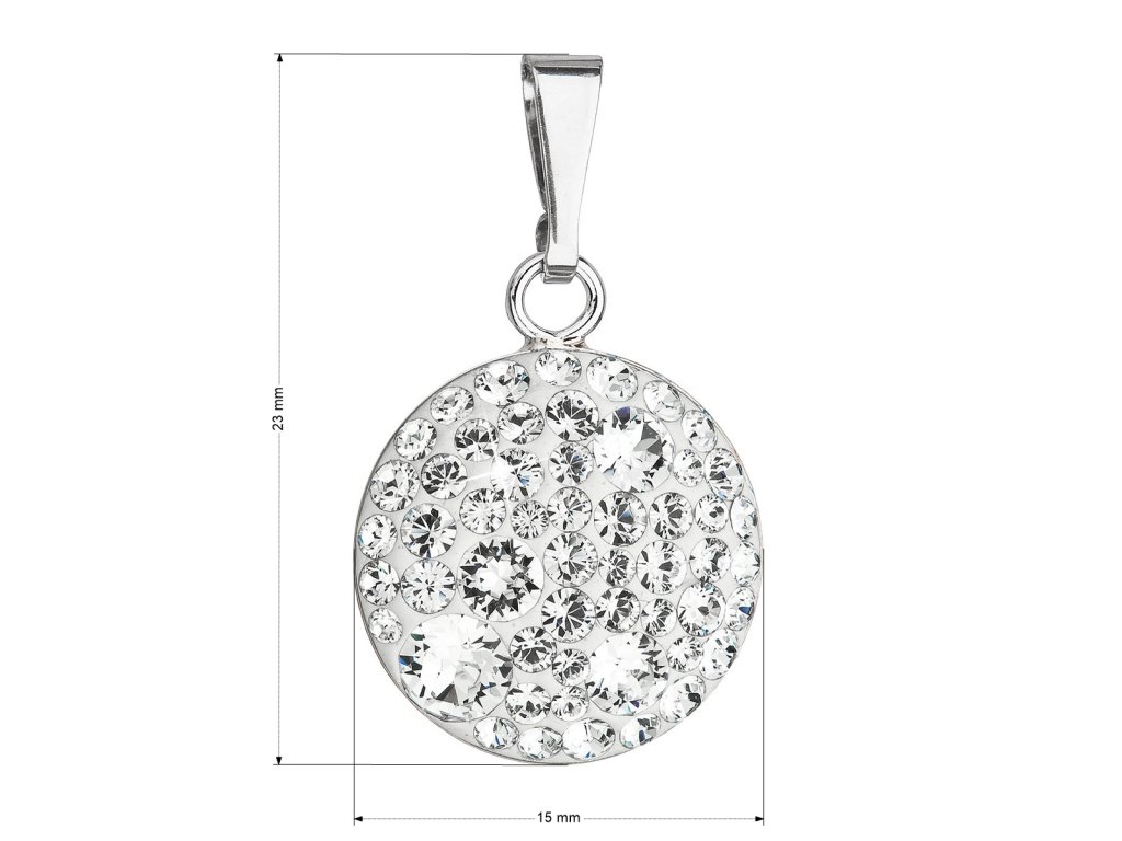 Strieborný okrúhly prívesok 34225.1 má priemer 15 mm a je zdobený mnohými malými okrúhlymi Swarovského krištáľmi v bielej farbe. Na prívesok bolo použité striebro rýdzosti 925/1000, ktorého povrch prešiel úpravou ródiom. Ródium šperk chráni pred sčernením, zažltnutím a poškrabaním. Prívesok neobsahuje nikel, a tak ho môžu bez obáv nosiť aj alergici.