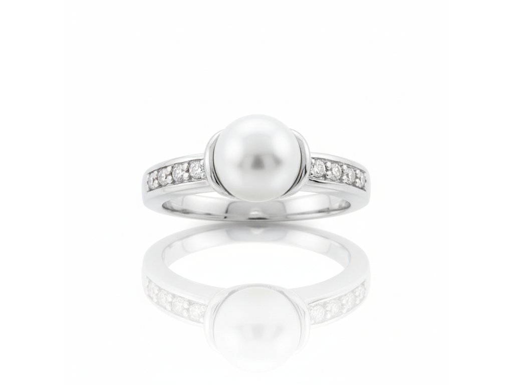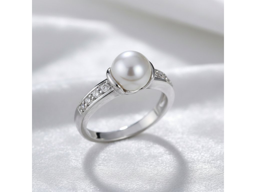 Strieborný prsteň s bielou perlou a zirkónmi po bokoch RPB36044