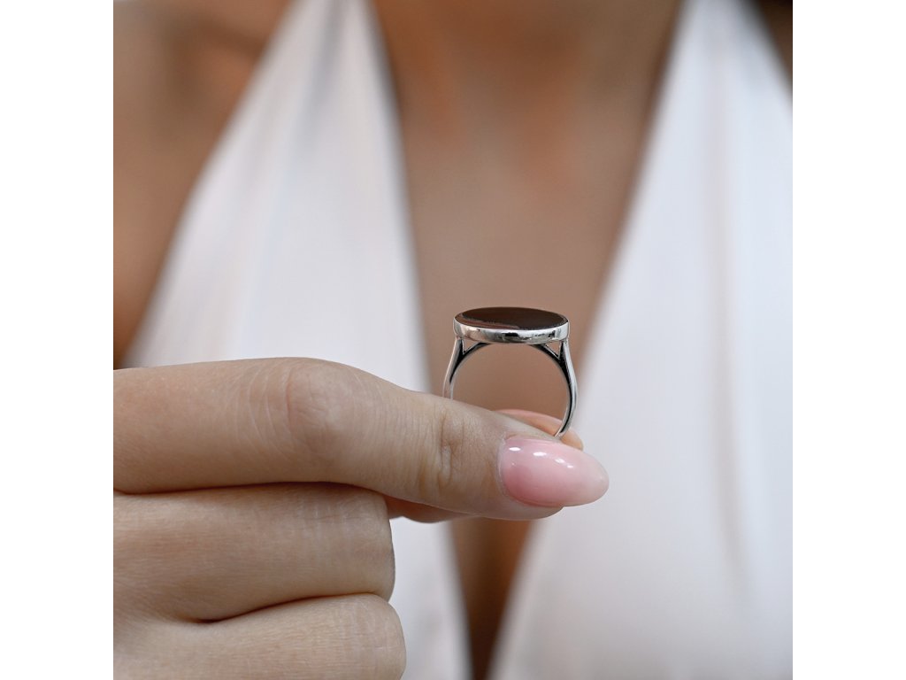 Prsteň je vyrobený zo striebra tej najvyššej kvality rýdzosti 925/1000, dokonale chráneného ródiovou úpravou. Rhodiovaný povrch nielen chráni šperk pred oxidáciou, ale zaisťuje aj jeho neprekonateľný lesk a odolnosť proti poškriabaniu. Okrúhly výrazný tvar s čiernou perleťou je decentne vykrojený, čo dodáva šperku jedinečný charakter.