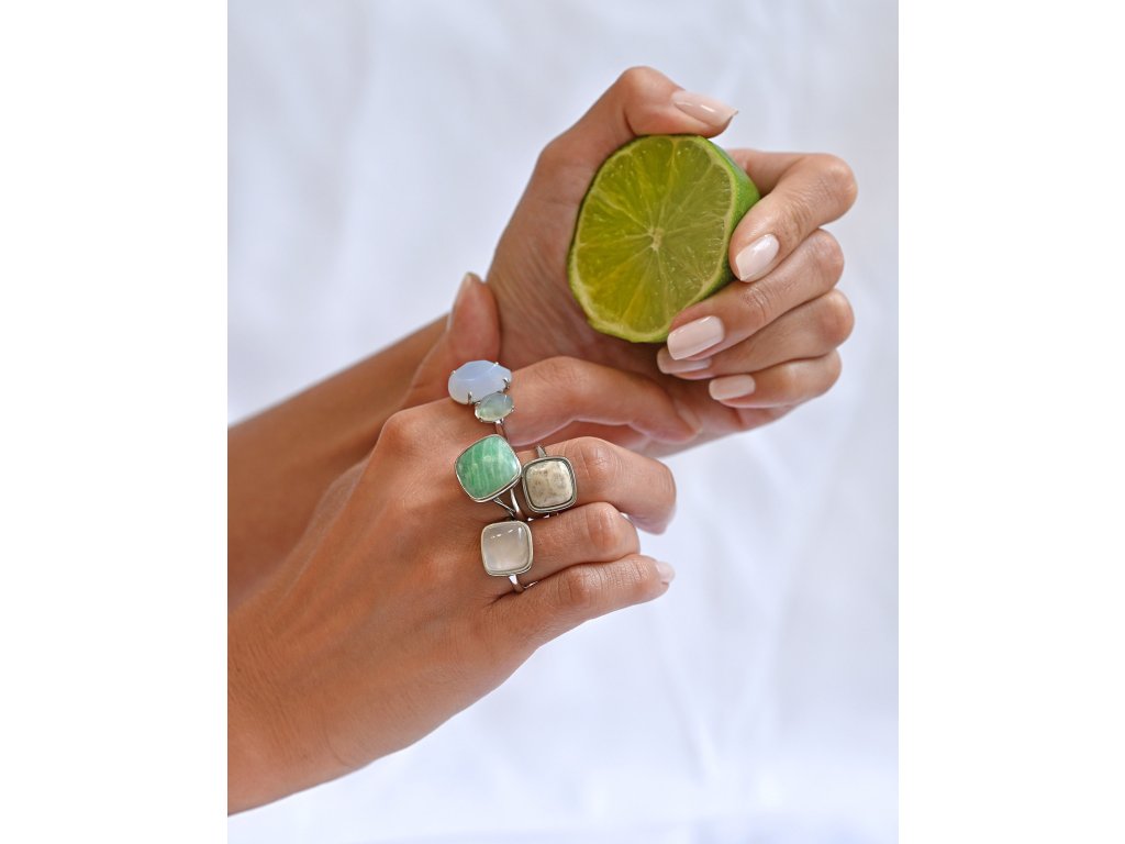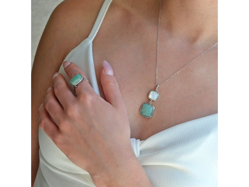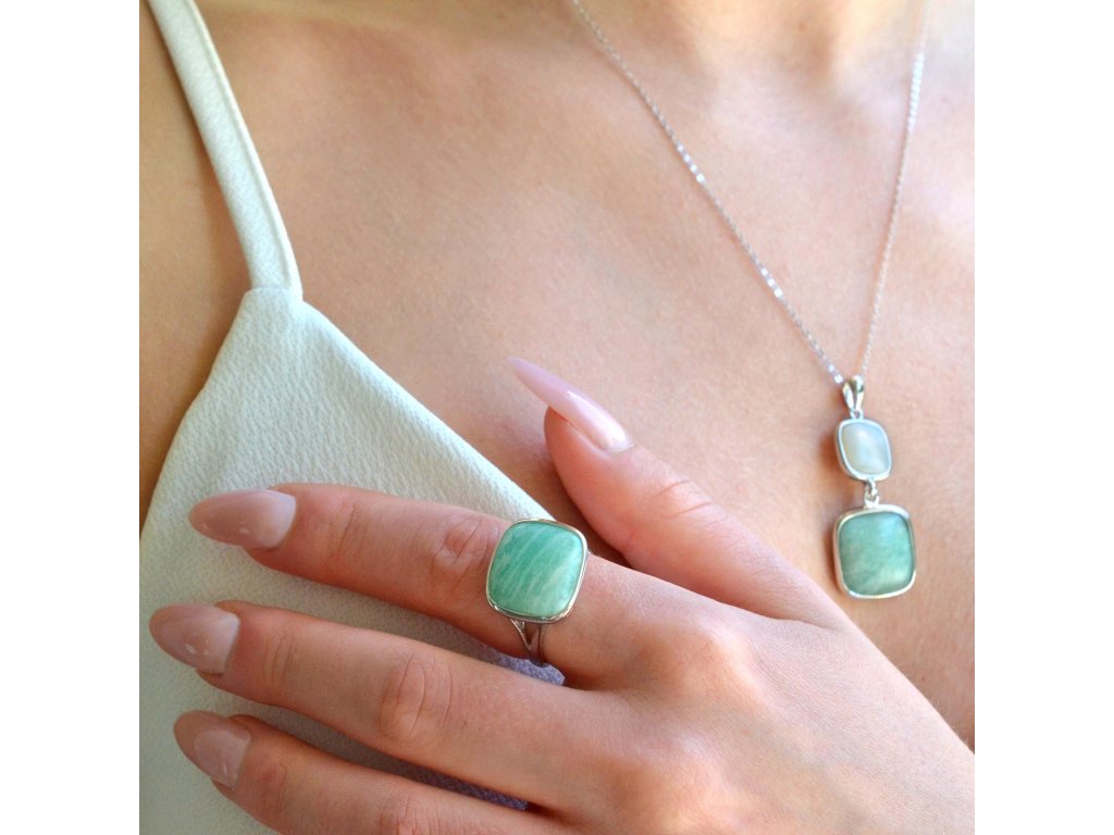 Prsteň je vyrobený zo striebra tej najvyššej kvality a ich povrch je dokonale chránený ródiovou úpravou. Ródium dodáva šperku neprekonateľný lesk a ochranu proti oxidácii. Výrazný štvorcový kameň amazonit v zelenkavých tónoch, ohraničený striebrom vytvára luxusný dojem. Ukrýva energiu pokoja a vnútornej sily.