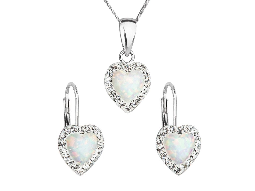 Sada 39161.1 obsahuje visiace náušnice a retiazku s príveskom v tvare srdiečka. Šperky sú vyrobené zo striebra rýdzosti 925/1000, ktoré prešlo povrchovou úpravou ródiom. Ródium chráni šperk proti sčerneniu, zožltnutiu i poškriabaniu. Prívesok aj náušnice sú zdobené bielym syntetickým opálom, ktorý je navyše olemovaný ešte malými trblietavými Preciosa krištáľmi v bielej farbe. Náušnice majú zapínanie na klapku. Keďže šperky neobsahujú žiadny prídavok niklu , môžu ich bez obáv nosiť aj alergici.