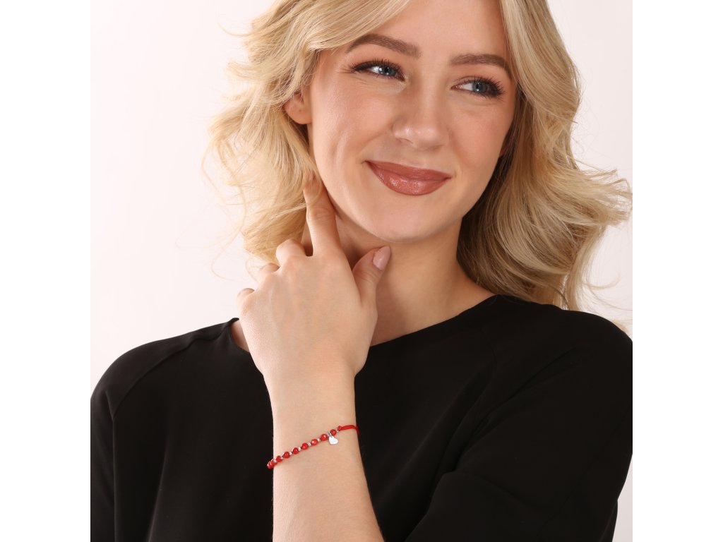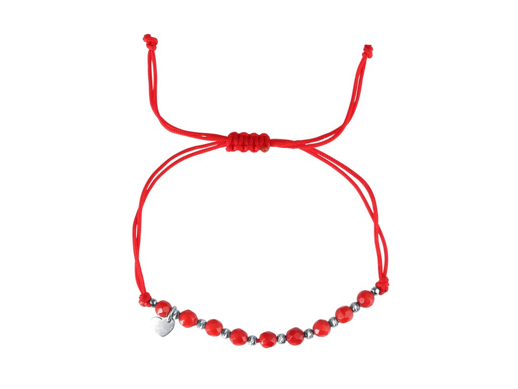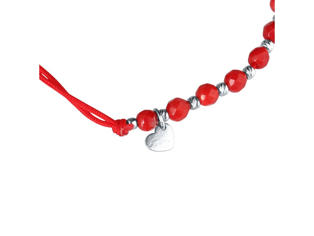 Je vyrobený z hladkej pevnej šnúrky a koralových korálikov, ktoré sa striedajú so striebornými guličkami, navyše je prizdobený príveskom tvaru srdiečka.