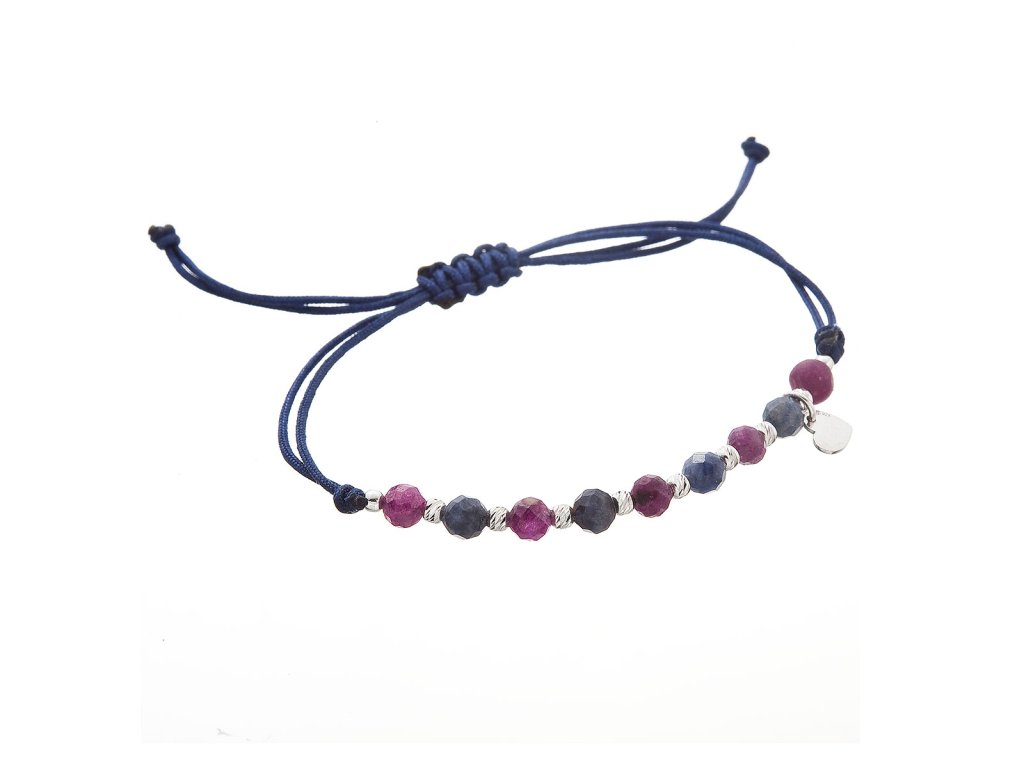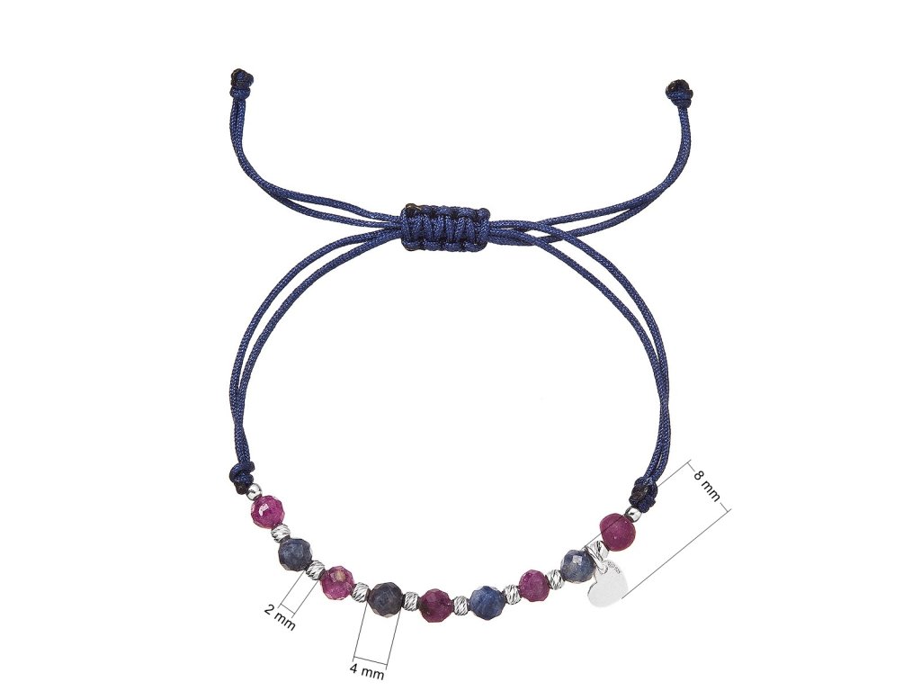 Je vyrobený z hladkej pevnej šnúrky a korálok z rubínu a zafíru, ktoré sa striedajú so striebornými guličkami, navyše je náramok prizdobený príveskom tvaru srdiečka.