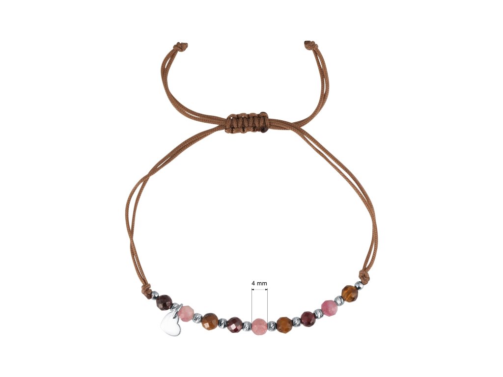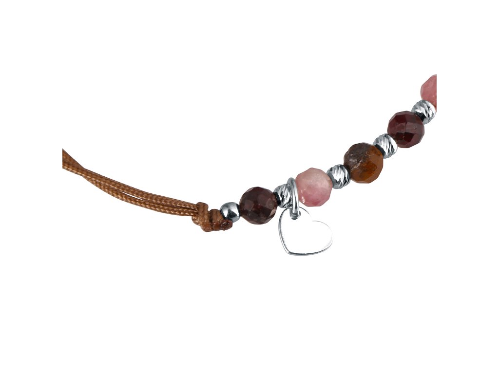 Je vyrobený z hladkej pevnej šnúrky a korálok z turmalínu, tigrieho oka a granátu, ktoré sa striedajú so striebornými guličkami, navyše je prizdobený príveskom tvaru srdiečka.