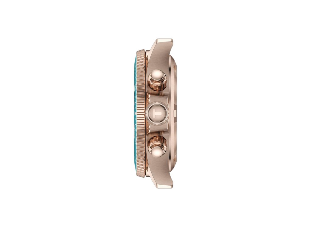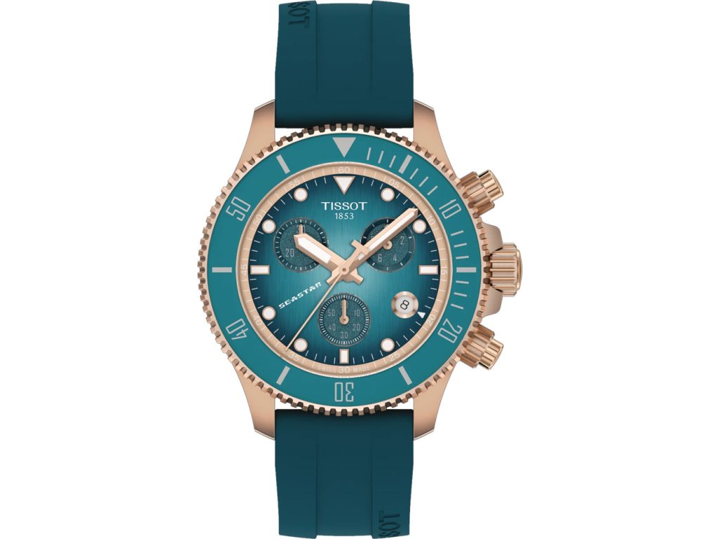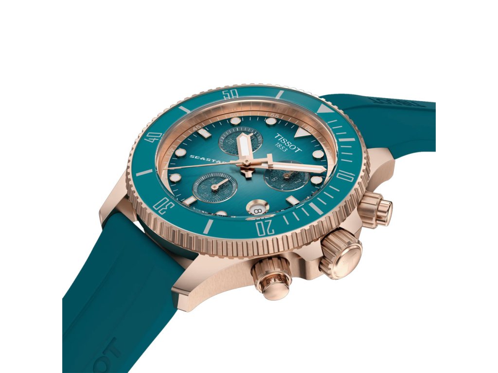 Model Tissot Seastar Quartz Chronograph v odvážnej farebnej kombinácii tyrkysovej a ružovozlatej ponúka nielen výnimočný dizajn, ale aj vysoký výkon pre každodenné dobrodružstvá a športové aktivity. Kompaktný 38 mm formát je ideálny pre menšie zápästia a vďaka kaučukovému remienku poskytuje maximálne pohodlie.