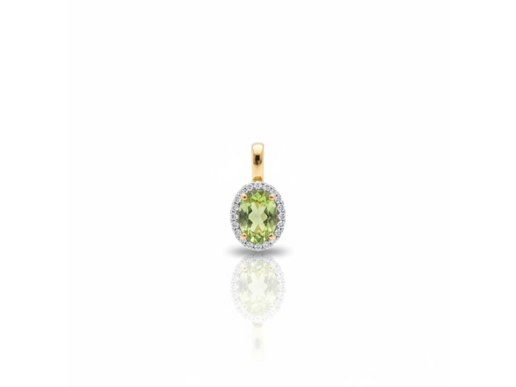 Trblietavý zlatý 14K prívesok osadený briliantmi a olivínom
