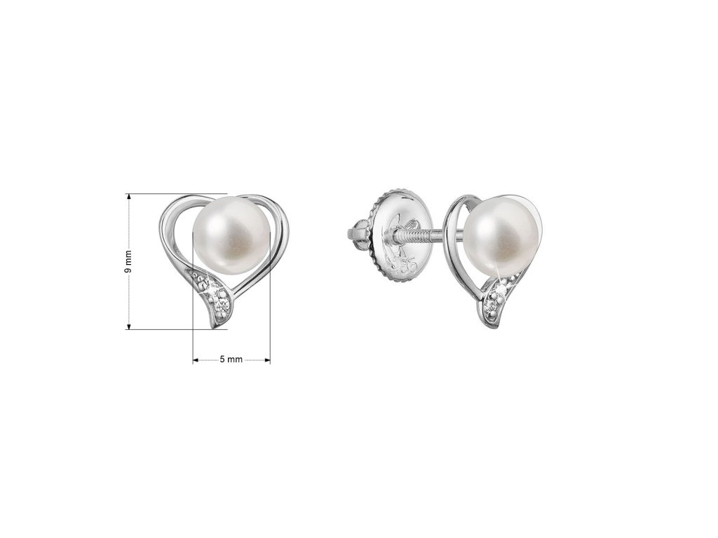 Na náušnice 81PB00054 bolo použité 14 karátové biele zlato s rýdzosťou 585/1000 a pravé kultivované sladkovodné riečne perly s briliantmi. Perly o veľkosti 5 mm sa môžu pochváliť najvyššou kvalitou AAA . Tvar zlatého srdiečka je zdobený nestarnúcimi briliantmi. Celkom 4 brilianty o 0,020 ct..