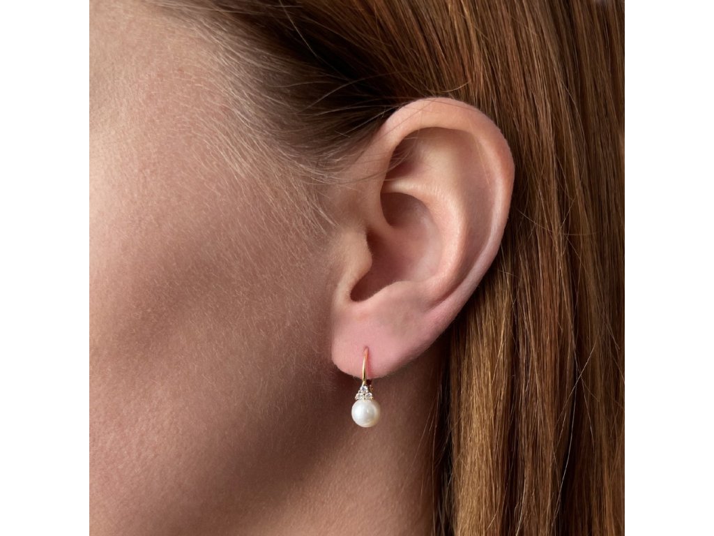 Nežné zlaté náušnice s guľatou riečnou perlou , ktoré vďaka trom malým zirkónom nad perličkou, upútajú pohľad na krásnu bielu perlu.