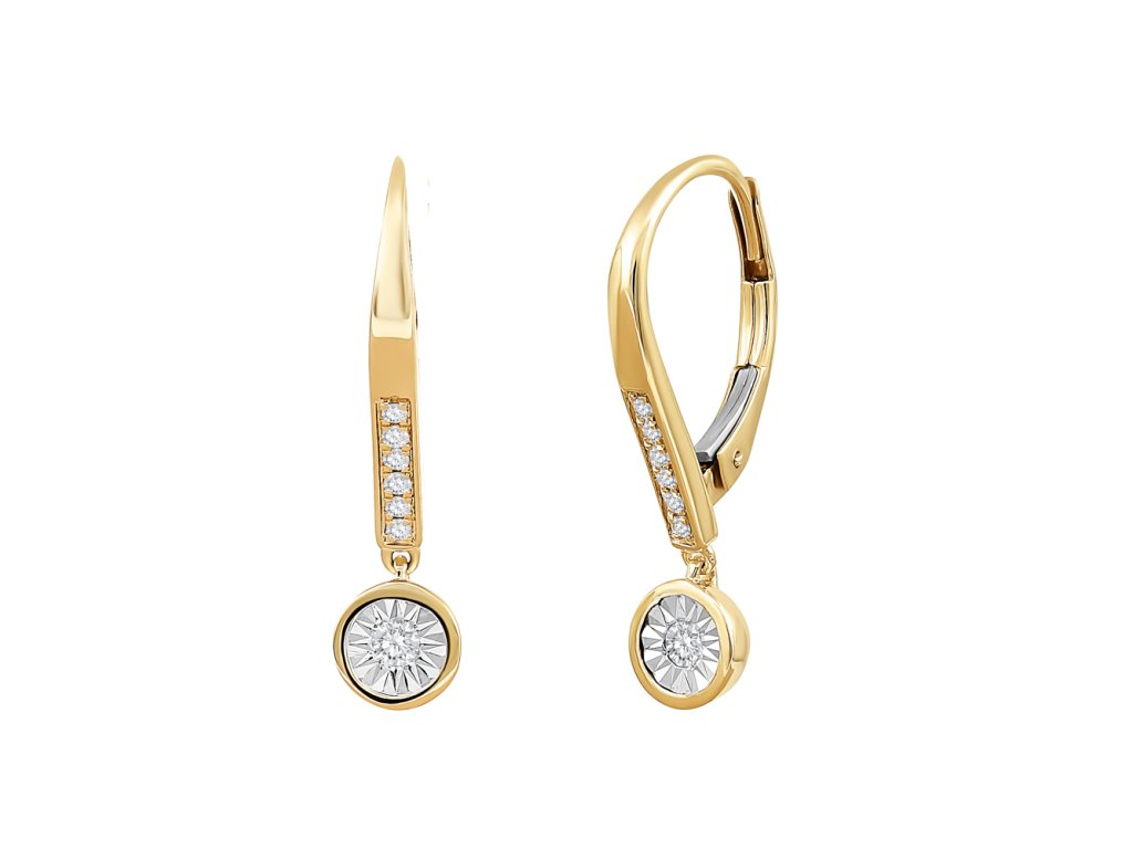 Elegantné dámske náušnice zo žltého zlata 585/1000 zaujmú moderným dizajnom s podlhovastým tvarom a jemne visiacím kruhovým príveskom. Osadené sú 14 diamantmi s briliantovým brúsom (SI2, H), ktoré im dodávajú očarujúci lesk. Jemná línia kameňov na ramienku náušnice v kombinácii s centrálnym žiarivým diamantom vytvára nadčasový a luxusný vzhľad.
