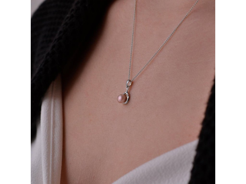 Náhrdelník 82PB00047 je vyrobený zo 14 karátového bieleho zlata s rýdzosťou 585/1000. Zdobí ho pravá kultivovaná sladkovodná riečna perla v ružovom tóne s priemerom 5 mm a kvalitou AAA, nad ktorou sa ligocú brilianty o váhe 0,015 ct.