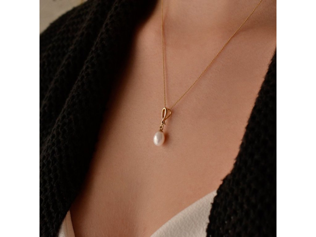 Zlatý náhrdelník s hojdajúcou sa oválnou perlou nad ktorou september briliant bude výrazným doplnkom pre Váš outfit.