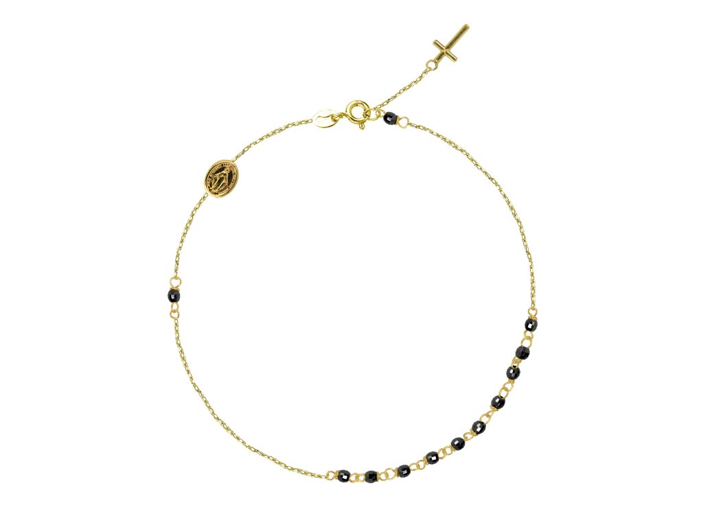Náramok je vyrobený zo žltého 14 karátového zlata a má po obvode malé čierne fazetované korálky .