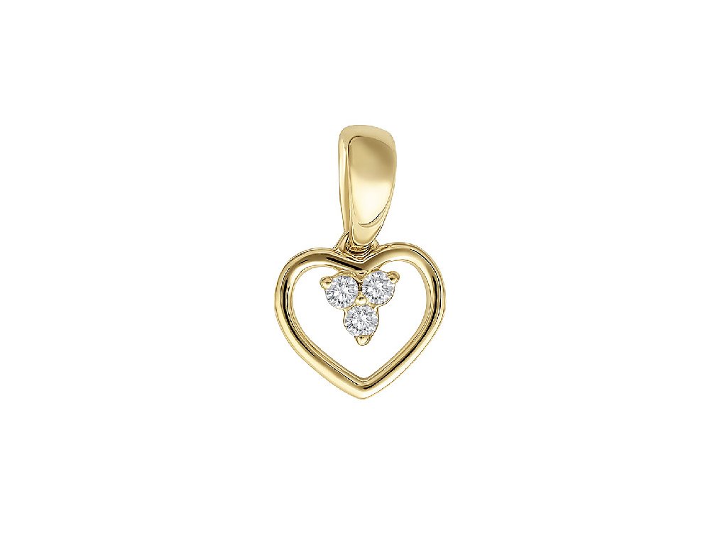 Elegantný prívesok v tvare srdca zo žltého zlata zdobený tromi žiarivými diamantmi uprostred, ktoré symbolizujú lásku, radosť a večnosť. Jemný dizajn otvoreného srdca pôsobí ľahko a vzdušne, no zároveň si zachováva luxusný charakter. Tento prívesok je ideálnym darčekom z lásky alebo krásnym doplnkom pre každý deň.